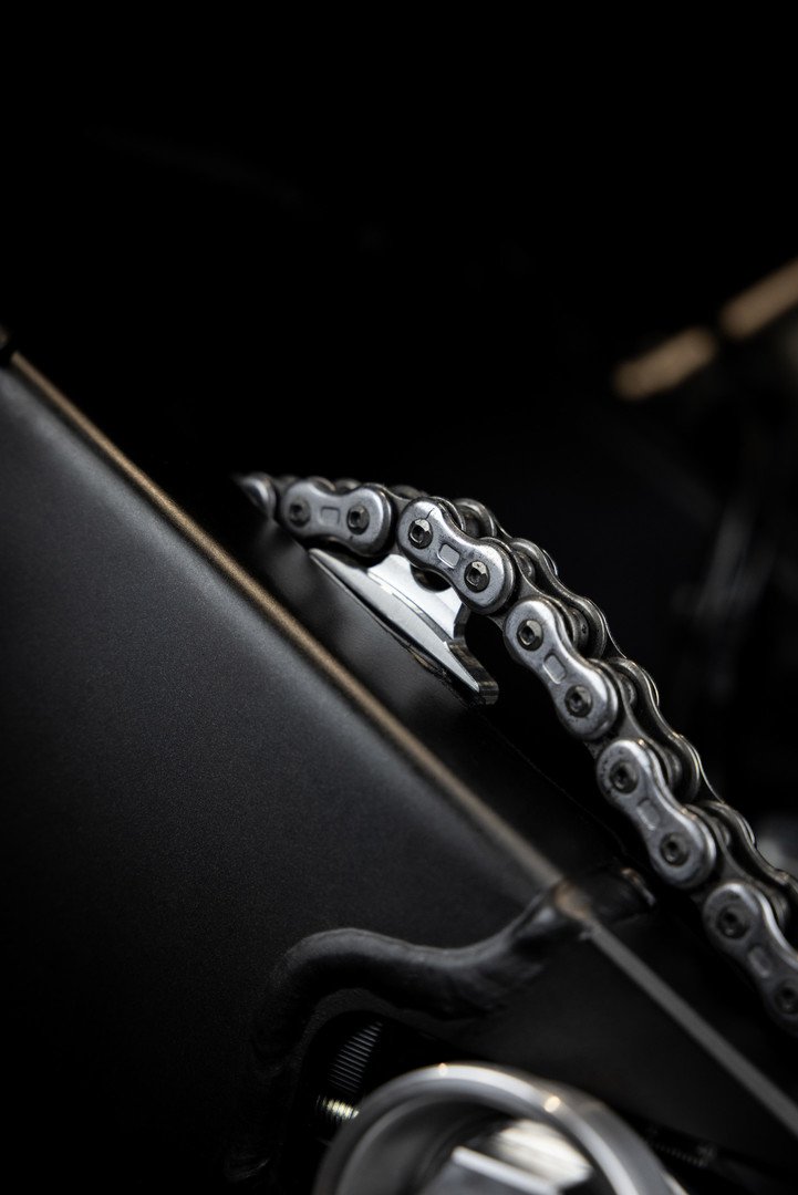 Der Kettenhalter wird von innen an der Schwinge angeschraubt.