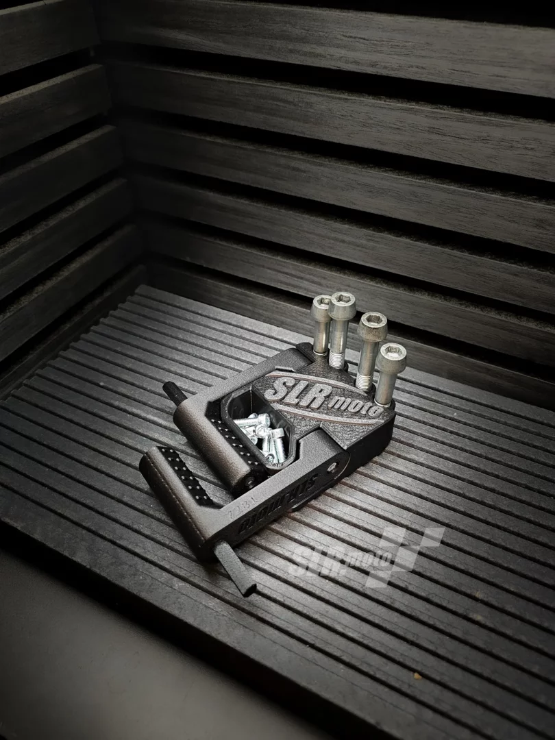 Unser Halter besteht aus kohlefaserverstärktem Kunststoff. Dadurch ist er nicht nur äußerst stabil, sondern schützt auch Bauteile am Motorrad vor Schäden bei Kontakt. Dank der Kohlefaserverstärkung ist der Halter besonders robust. Und falls die Führungsstifte doch einmal kaputtgehen sollten, lassen sie sich – wie es sich für ein Qualitätsprodukt gehört – problemlos als Ersatzteil nachbestellen.