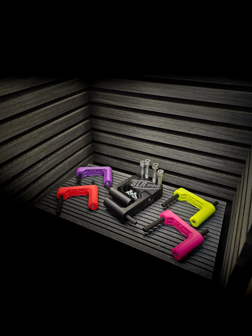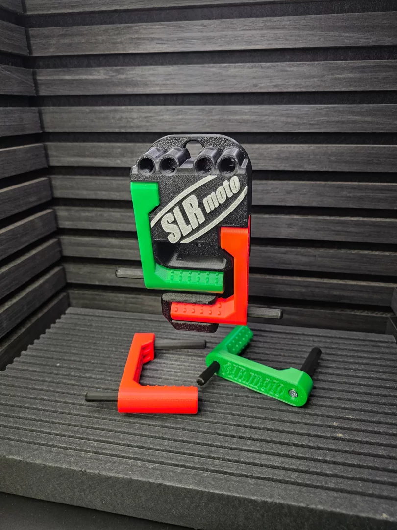 Praktisch: Im Lieferumfang ist außerdem ein passender Wandhalter enthalten. Dieser kann über die 3 Bohrungen an die Wand geschraubt werden oder alternativ über die große Öffnung in der Mitte einfach an einen vorhandenen Haken oder Ähnliches gehängt werden. Der Wandhalter hält die Bremssattelhalter nicht nur sicher an der Wand, sondern auch kompakt zusammen – ideal, wenn sie in der Werkzeugkiste ihren Platz finden.